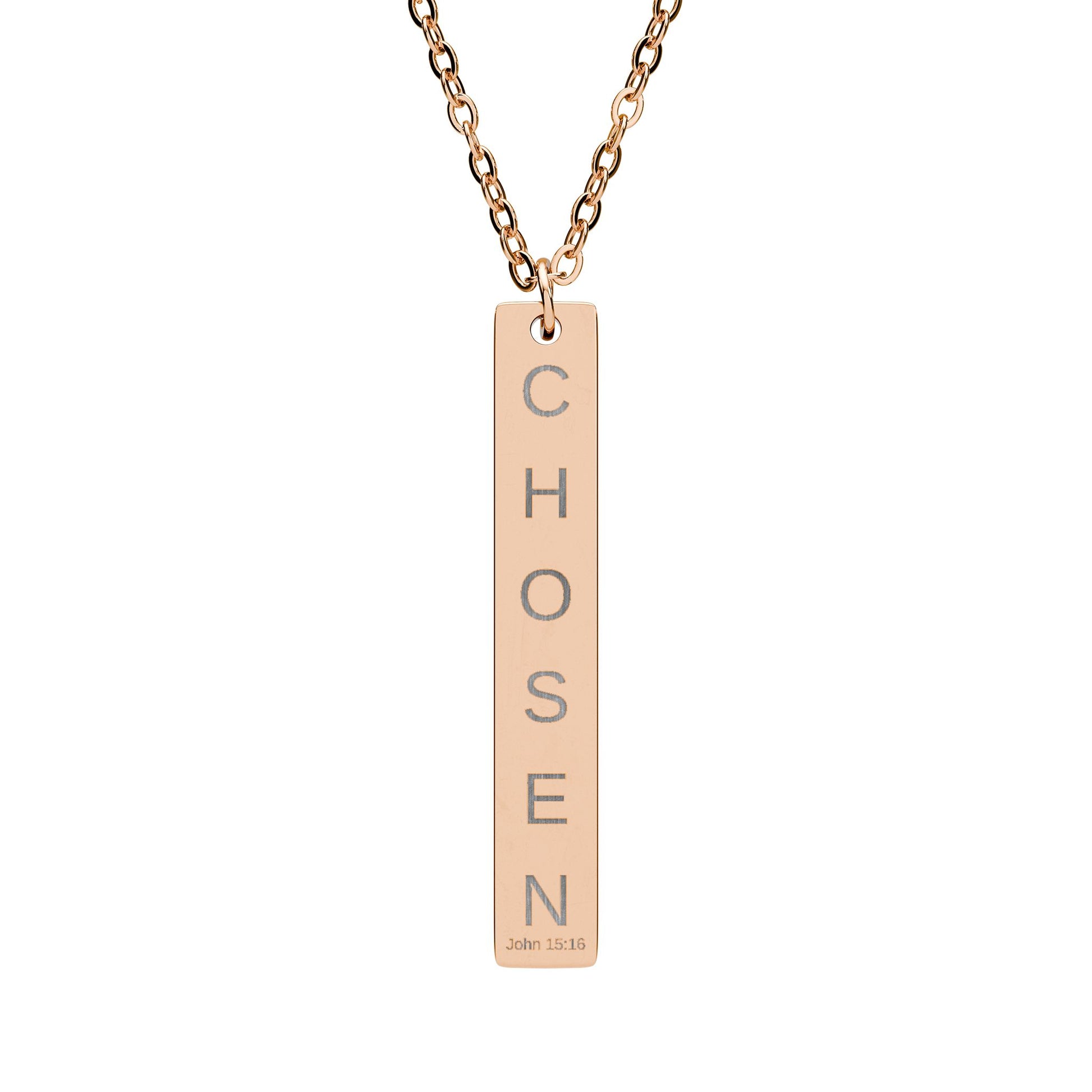 Elegantly crafted, our CHOSEN Vertical Bar Necklace is the perfect statement piece for any believer and jewelry lover. Its sleek design and engraved touch convey a sense of sophisticated simplicity, making it versatile enough for both casual and formal occasions. This necklace adds a unique flair that can easily elevate any outfit & resonates with those who appreciate meaningful accessories, making it an excellent choice for birthdays, anniversaries, or as a thoughtful gesture of friendship. Perfect for a loved one or as a treat for yourself, this necklace serves as a daily reminder of how amazing it is to be 'CHOSEN' by Jesus!