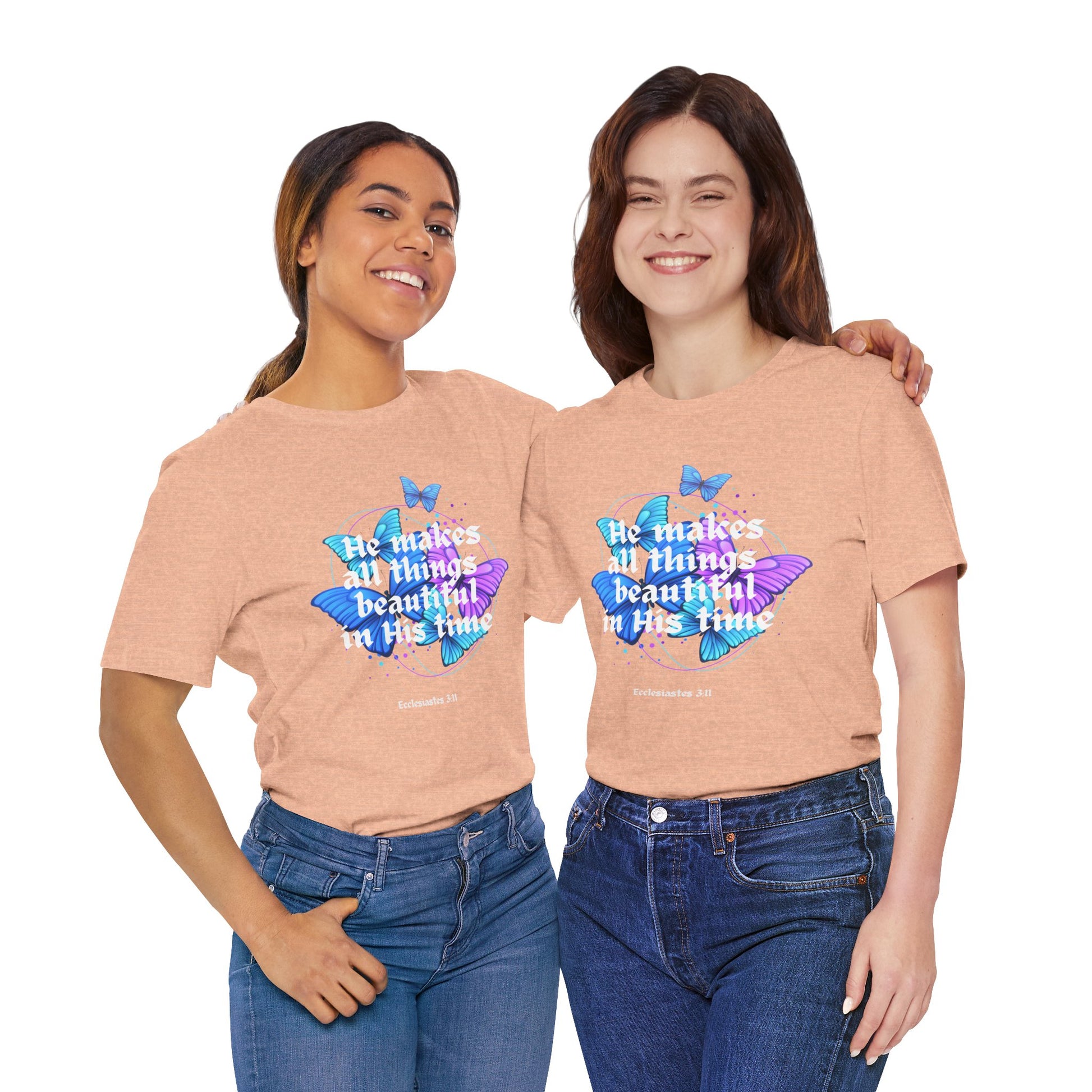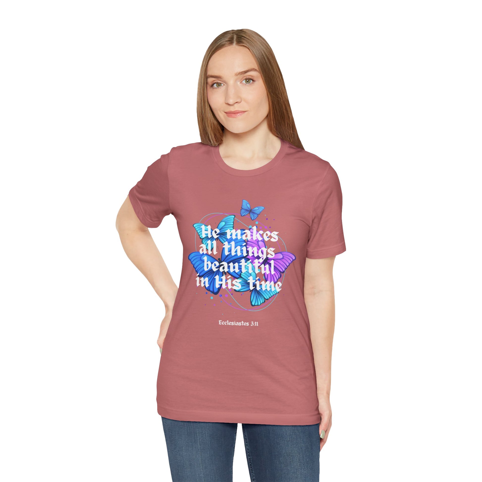 Embrace God’s perfect timing with our *He Makes All Things Beautiful in Its Time* T-shirt, inspired by Ecclesiastes 3:11. A gentle reminder that every season holds purpose, this tee carries a message of hope, faith, and trust in God’s eternal plan. Soft, comfortable, and uplifting—ideal for those who walk confidently in His promises.