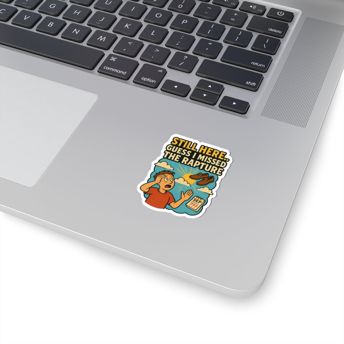 "This hilarious sticker features a retro cartoon design with the phrase ‘Still Here… Guess I Missed the Rapture’. Inspired by the viral #RaptureTok trend, it’s a funny Christian meme sticker that’s perfect for decorating laptops, water bottles, notebooks, and more. Durable, high-quality, and easy to peel — a must-have for anyone who loves faith-based humor and viral TikTok trends."
